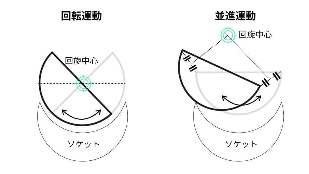 一方の並進運動というのは、関節のソケットから外れたところに、骨頭の回旋中心が存在している状態を言います。