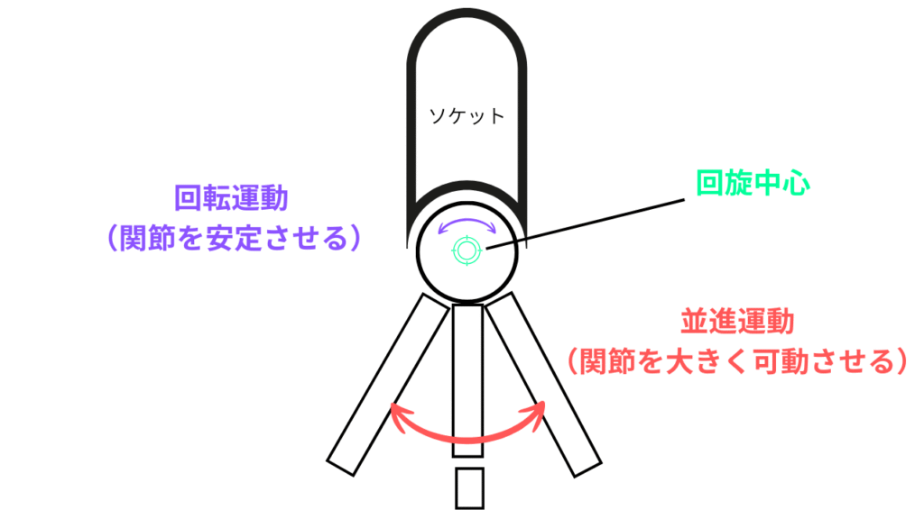 上図のように、関節の回旋中心がソケット内にある状態で行なわれる、回転運動が行われることで、