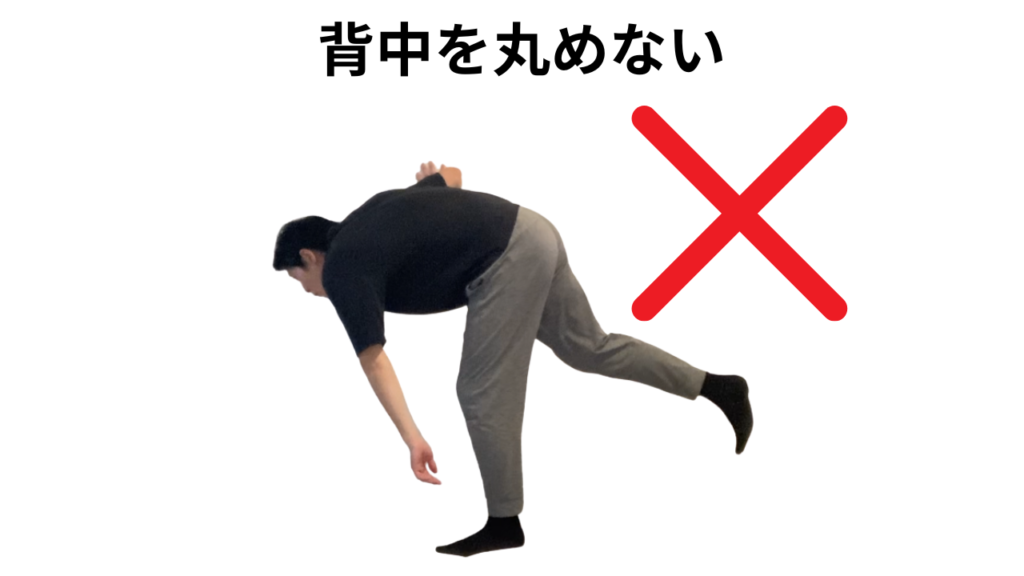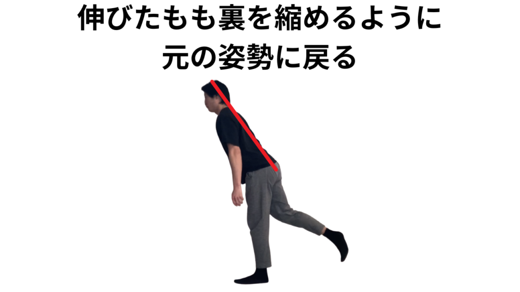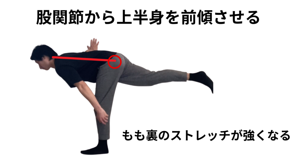 動作に慣れてきたら上半身の前傾を深くすることで、もも裏のストレッチを高めていきましょう。