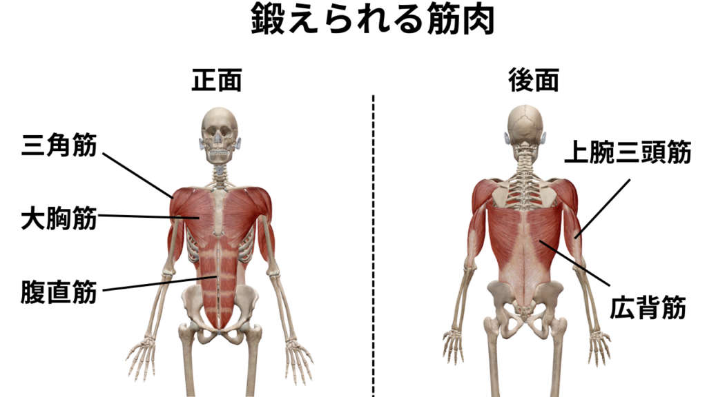 ひざつき腕立て伏せでは、体の前面の筋肉である大胸筋(だいきょうきん)と腹直筋(ふくちょくきん)に加え、