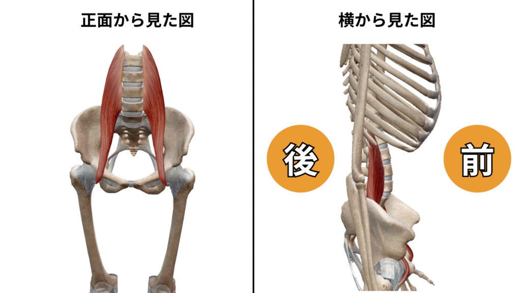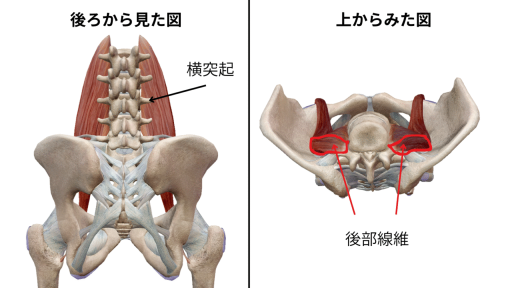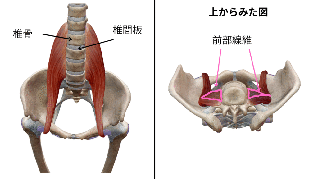大腰筋は、前部線維と、後部線維に分けられます。それぞれ、起始部が異なってきます。