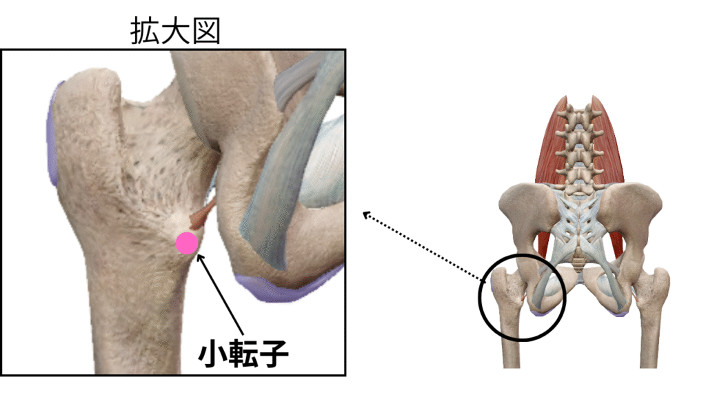大腰筋の停止部(前部線維、後部線維とも共通)