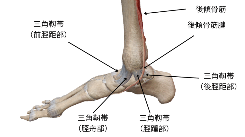 また、これらの足関節の外側にある靱帯組織のみではなく、内側にある三角靱帯、後脛骨筋腱などにも損傷がみられる。
