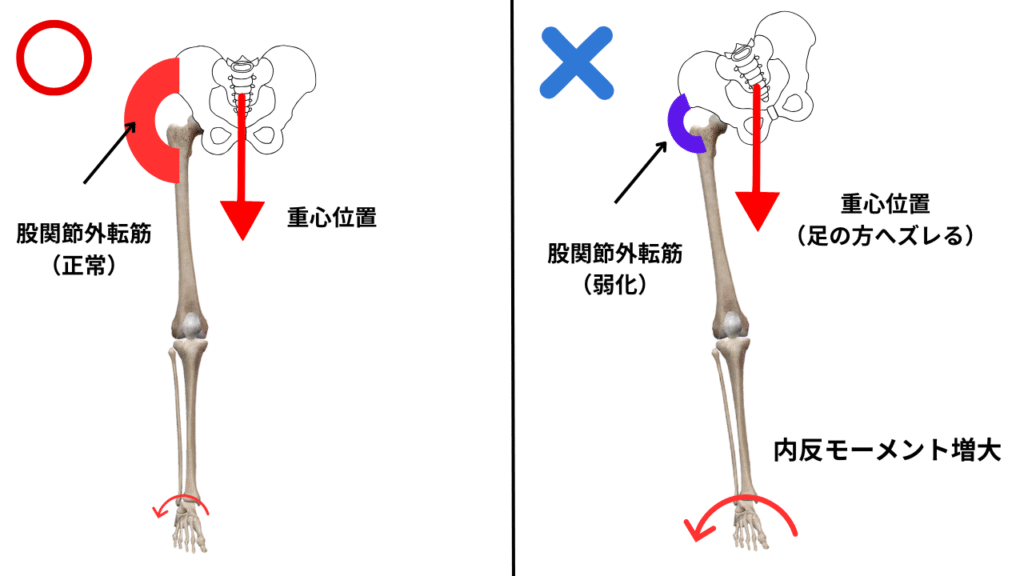 体幹周囲の筋肉が弱化している場合、外力に対して上半身が傾斜してしまい、内反モーメントが増大します。