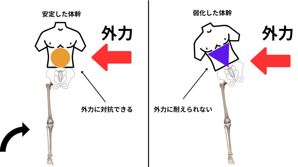 また、上半身にかかる外力に対抗したり、体幹が傾いてしまうことを制動させるためには、体幹周囲の筋肉の活動が不可欠となります。