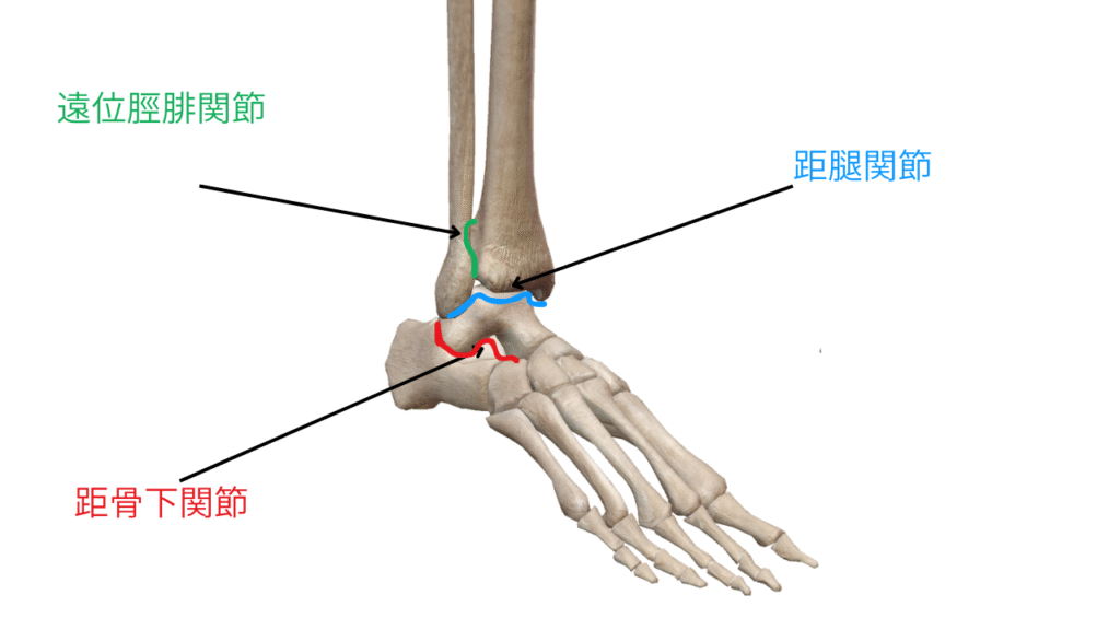 足関節は、距腿関節、距骨下関節、遠位脛腓関節の3つから構成されている複合関節です。