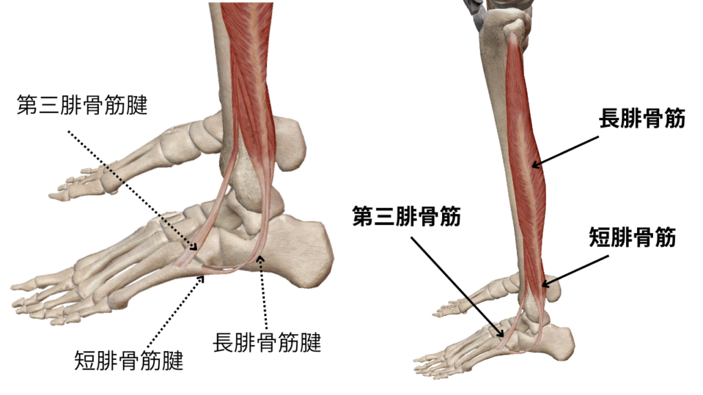 足の内反を制動する筋肉は、腓骨筋群(長腓骨筋、短腓骨筋、第三腓骨筋)が大きく関与しています。